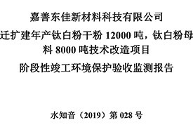 公?? 示??? 根據(jù)《國(guó)務(wù)院關(guān)于修改〈建設(shè)項(xiàng)目竣工環(huán)境保護(hù)管理?xiàng)l例〉的決定》(國(guó)務(wù)院令第682號(hào)),以及環(huán)保部《關(guān)于發(fā)布的公告》(國(guó)環(huán)規(guī)環(huán)評(píng)[2017]4號(hào)),現(xiàn)將嘉善東佳新材料科技有限公司遷擴(kuò)建年產(chǎn)鈦白粉干粉12000噸,鈦白粉母料8000噸技術(shù)改造項(xiàng)目階段性竣工環(huán)境保護(hù)